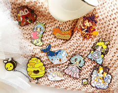 | Examples showing some defects - poor plating, dripped/overrun enamel | Examples of potential coloration issues -- these tend to be present only in certain specific batches. if you're unsure, send us a message. | Examples of common defects - scratches, pores, specks, and punctures. |
