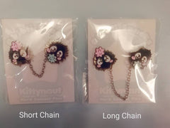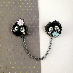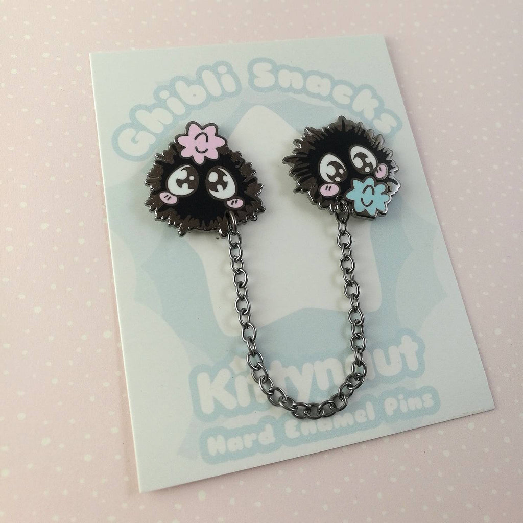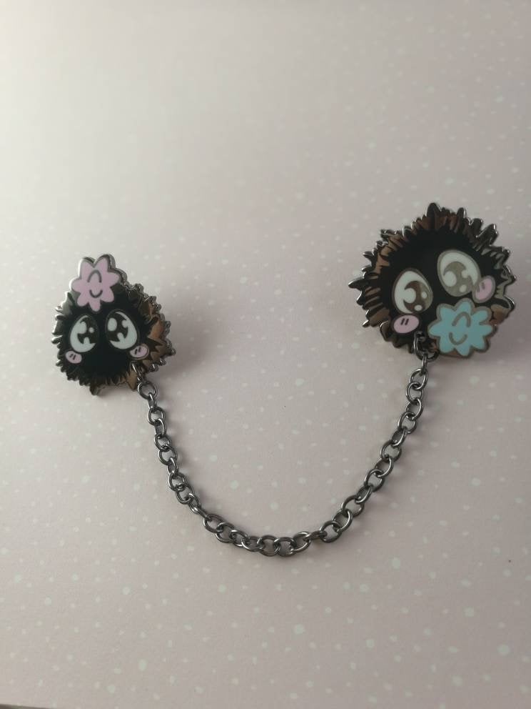 Super cute enamel pins attached by a chain. Two chain lengths available. Chain MAY BE EITHER SILVER OR BLACK (it is random).