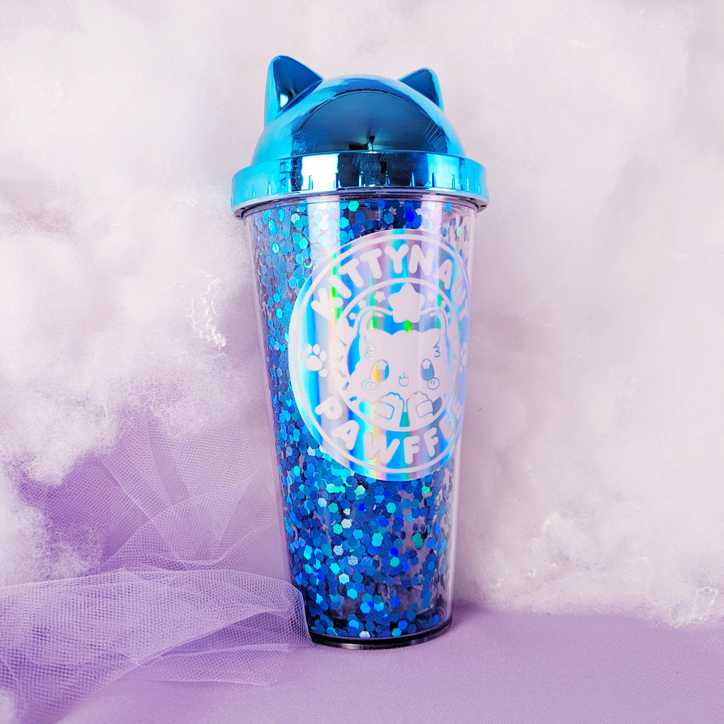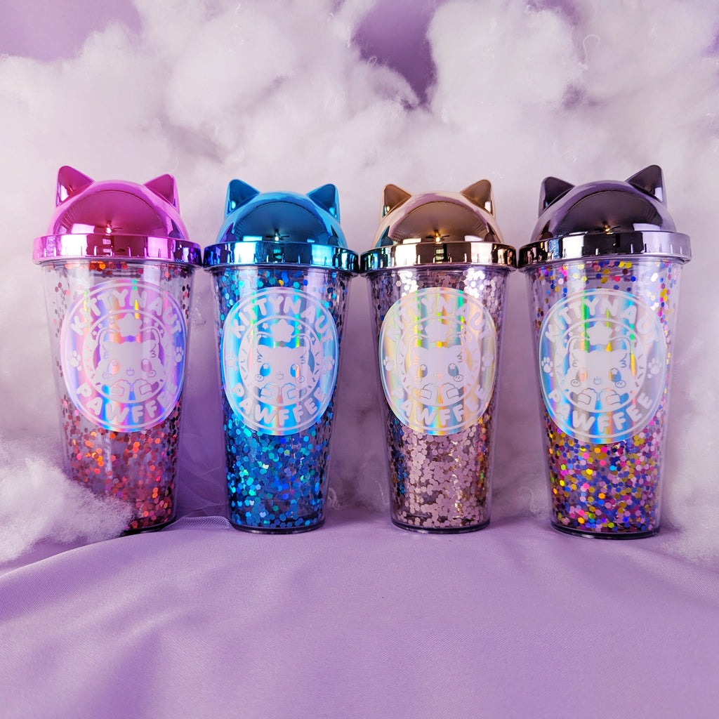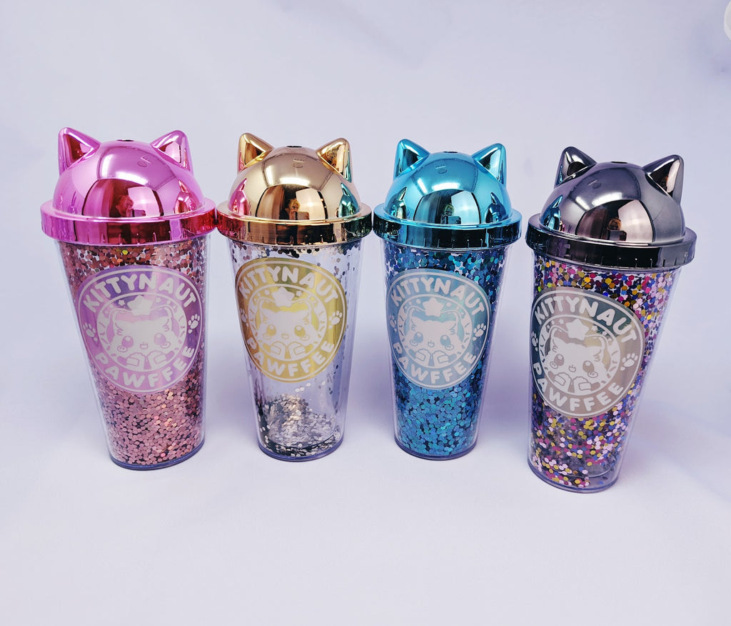 Now you can have your very own Kittynaut Pawfee tumbler!  Features domed kittyear lid with rubber gasket to prevent leaks and pretty iridescent glitter